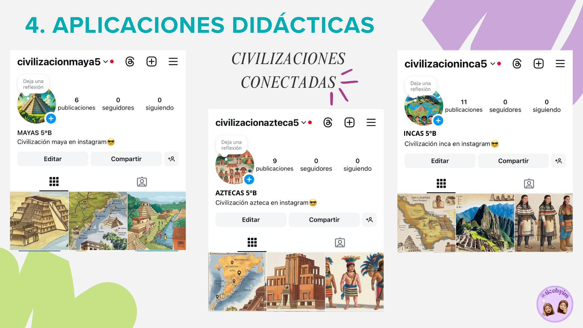 Para llevar a cabo esta actividad vamos a dividir a la clase en tres grupos, cada uno de ellos será el encargado de una civilización (incas, mayas y aztecas). Cada grupo debe investigar la historia, costumbres, monumentos, etc, de cada civilización, recopilando imágenes, datos interesantes, dibujos o incluso maquetas. Los grupos crearán una cuenta de Instagram para cada civilización, que tienen que personalizar según las características de su civilización. Los alumnos irán haciendo publicaciones sobre los aspectos que han investigado, para poder presentarlo y compartirlo con los otros grupos.