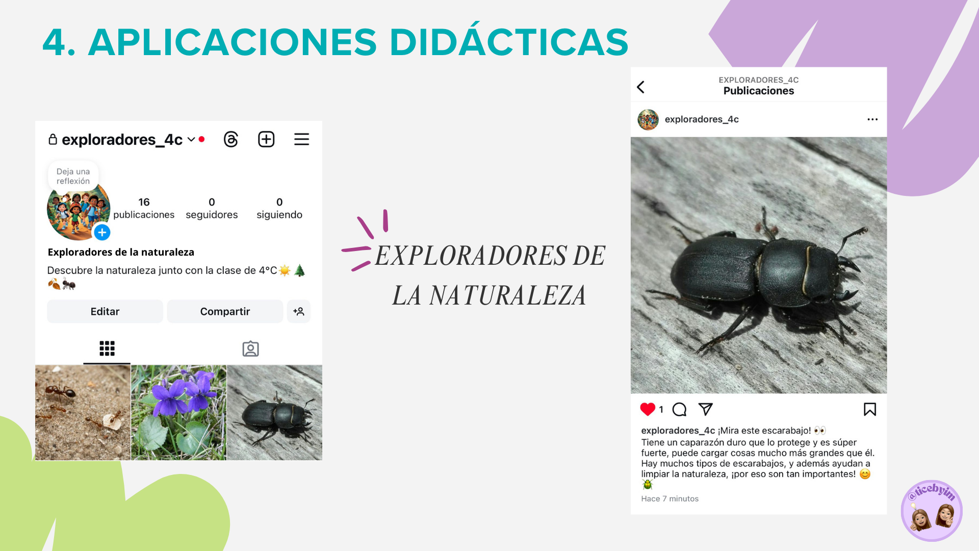 Tras aprender la clasificación de los animales, los ecosistemas y sus tres elementos, en pequeños grupos se realizará una salida al patio del colegio, un parque o zona natural cercana para observar y registrar diferentes especies (plantas, insectos, animales, etc.). Los alumnos, en sus grupos, harán una recopilación de esas especies añadiendo su nombre, características y/o curiosidades. Para crear publicaciones que se irán subiendo a una cuenta de Instagram que el docente ha creado. De esta forma, tendremos una cuenta de Instagram a la que podrán acceder tanto alumnos como padres y docentes en la que encontraremos todas las especies que han encontrado como exploradores.