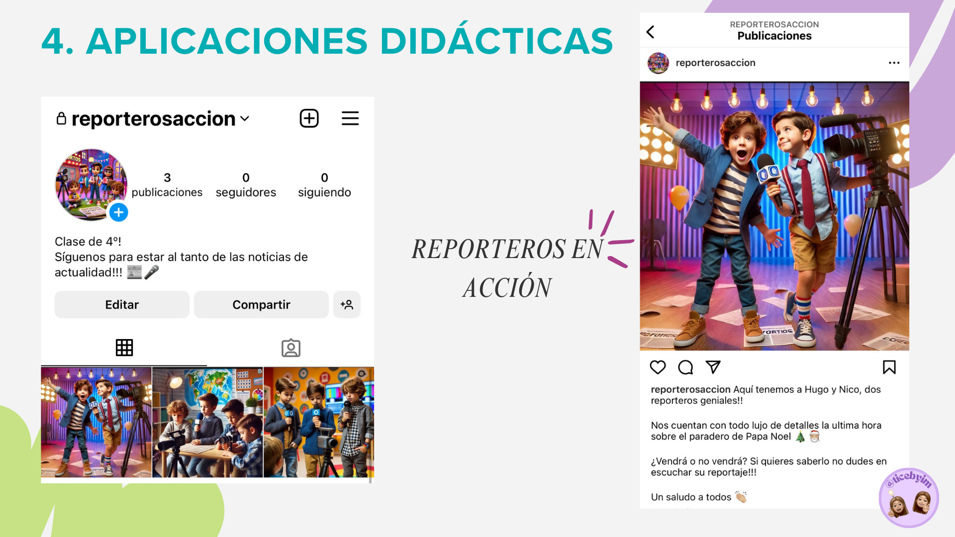 Tras aprender las noticias y su estructura de forma escrita, con esta actividad pasaremos a ser reporteros. Por parejas o grupos reducidos, los alumnos redactarán una noticia relacionada con su entorno, por ejemplo, el encendido de luces de navidad de su pueblo. Después grabarán su noticias como si fuesen reporteros, para posteriormente subirlo a una cuenta de instagram creada por el docente en la que se irán subiendo todos los vídeos creados por los alumnos. Esta cuenta, puede seguir utilizándose a lo largo del curso para añadir noticias de actividades que se realicen en el aula. Así la clase tendrá una cuenta de instagram que pueden utilizar como telediario donde se recopilan todas las noticias creadas y grabadas.