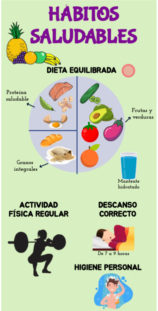 Los compañeros que trabajaron este tema nos mandaron en la práctica realizar una infografía, sobre el tema que nosotros eligiésemos. En nuestro caso, realizamos una infografía sobre los hábitos saludables, en la que encontramos divididos por puntos, los diferentes hábitos que debemos seguir para llevar una vida saludable: la dieta saludable, con el plato de Harvard, la actividad física, el correcto descanso y la higiene personal.